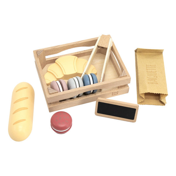 Met deze leuke Label Label Houten Baguette Set, verkoopt jouw kindje macarons en andere lekkernijen als zoete broodjes over de toonbank. De set wordt geleverd met verschillende smaken macarons, een croissant, een baguette, een zakje en een tangetje om de verkochte broodjes hygiënisch te kunnen pakken voor de klant.